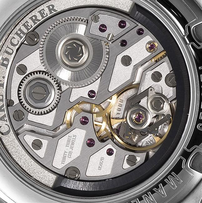 2009年CARL F. BUCHERER宝齐莱首度推出自制机芯时率先将它使用在Patravi EvoTech这个非圆壳的新系列当中;一般来说枕型表壳多半不是一个品牌的主力产品,宝齐莱也是如此,因此当初他们对这枚机芯的实用化可以说是从外围开始做起,直到2012年后才转用到Patravi的圆壳版,而这款则是隔年推出在Manero系列上的版本。A1000系机芯最主要的特徵自然是环形自动盘,甚至在它之后牵动了业界一阵环形自动盘的潮流,将这个一度被放弃的概念重新带回市场。然而除此之外A1000的表面格局也很有特色,像是它大日期和星期的位置就不是一般常见的配置;动力储存显示并不是A1000系一开始就有的功能,而是要到2010年才加上去的,当时它在EvoTech上,由于表壳是枕型的,因此它的显示方式也是接近直线式,在一道微弯轨道中以游标指示,而到了像Manero这样偏古典的圆壳时就改採一般比较常见扇形样式。