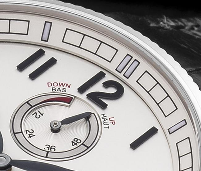 呼应表款名称,而圆盘式的动力储存显示可以说是这种印象的关键。轨道式刻度在时标处有断开,此为它和其他相近款式的差别之一。