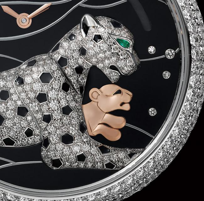 面盘上诗意的场景令人着迷,当轻轻按压表冠,一头小美洲豹将从母亲怀中跃出,并伴随蜂鸟飞舞,如临草原般动人。