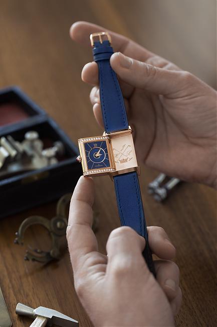 经典Duetto系列 -两枚背对背的表盘,虽然彼此的指针逆向运转,却是由同一枚机芯驱动,如此匠心独具的巧思,搭配其装饰艺术的设计灵感,实在令人心醉神迷。除了可翻转的防护功能,在翻转表壳时显露出的表背,克莱尔通过客制化订制,刻上她的家徽,小孩的名字缩写,以及两个马球槌。将围绕她生命裡重要的两个核心:她的家人和她的热爱的马球运动,紧密承载于手腕间。而红宝石表冠则象徵着胜利,分享和爱的寓意。