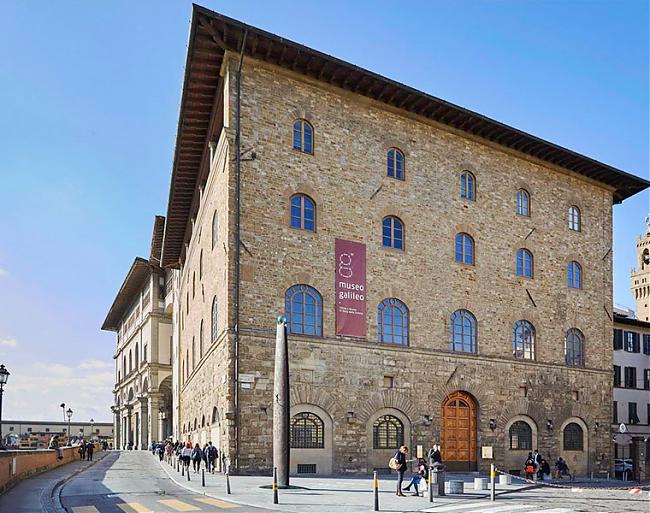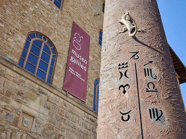 伽利略博物馆的日晷由刻于行人道的刻度盘及两根分别象徵日与夜的铜柱晷针组成。代表日间的铜柱面朝南方的阿诺河,柱身刻有垂直的子午线,柱上呈半蛇半蜥蝪造型的「露西法」魔鬼,尾巴在日照下投影于子午线上,显示一年中各段时间的正午位置。代表夜间的铜柱面朝北方,柱身刻有两个能辨识极星的星座:大熊座(Ursa Major) 及熊座(Ursa Minor)。晷针底部的风玫瑰标显示地理方向定位。地面以大理洞石及黄铜铺砌的子午线,伴以玻璃及大理石星座符号,由博物馆入口向外延伸约15米。冬至及夏至时,日影分别落在博物馆入口及晷针底部。大理洞石上有多条弧线贯穿子午线,可显示日期;而黄铜放射线则与冬夏至弧线形成方格,显示小时。