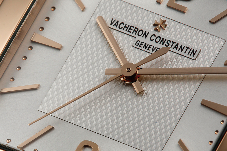 面盘中心饰有手工机刻雕花,近似菱形的几何图案是原款设计的再现,不但突出了别致的表壳形状,更以精细的中空珍珠状分鐘刻度巧妙地点缀于金质面盘之上,展现典雅气质,而且面盘还採用了镀银乳白色表层拋光处理,精细紧密的线条和光学效果证明了工匠为其倾注的大量心血, 盘面的几何菱形机刻雕花,和透明底盖裡自动盘上的机刻雕花相互呼应,展现出内外呼应、整齐划一的几何美学风范。