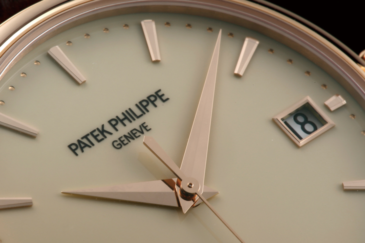 Ref. 5227新款腕表的表环边缘同样呈凹面效果,框示流丽工整的表面,恰到好处。表面一如表壳,贯彻包豪斯「功能指导形状」的恆久哲学,淡黄色亮漆表面,崇尚本质。表面搭配金制梯形小时刻度及珍珠米粒立体分鐘显示,精致秀丽;日期显示窗设于叁点鐘位置,缀以金框,打磨有致。剑型时针与分针以K金制造,秒针备有平衡重体,携手在优雅的舞台上,演绎分秒时刻,万分迷人。