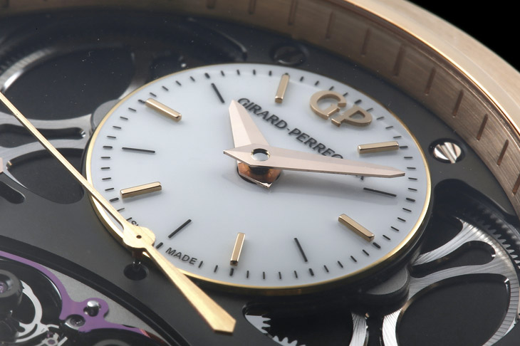 表款採用中央大秒针搭配偏心时分盘的配置,从机芯侧来看指针刚刚好就是位在四番车和二番车的正上方,没经过任何中介轮,一本GP工整的轮系路径。时分盘本身的立体感也很好。
