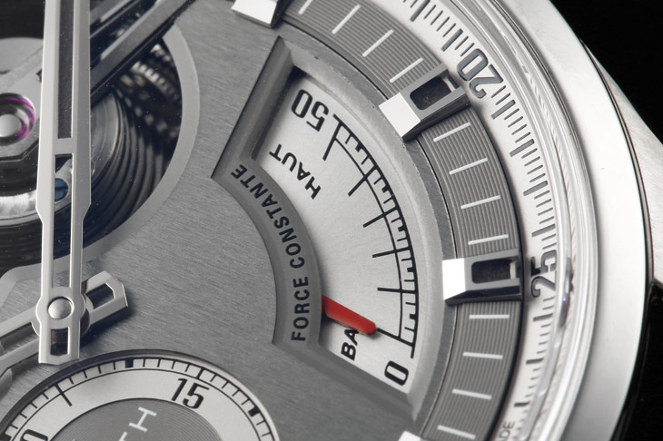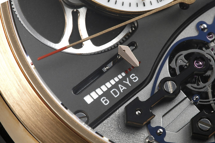 表面的左边有一个直线式的动力储存显示,机芯具备约七天的动力。系统在2008年发表时原本採用10Hz的震频,后来甚至实验过15Hz的高震频,但最后产品化时还是朝低震频、长动力的方向发展。