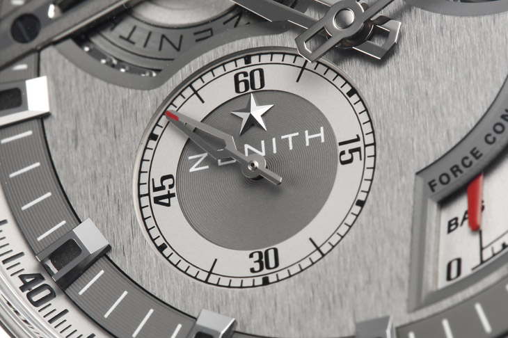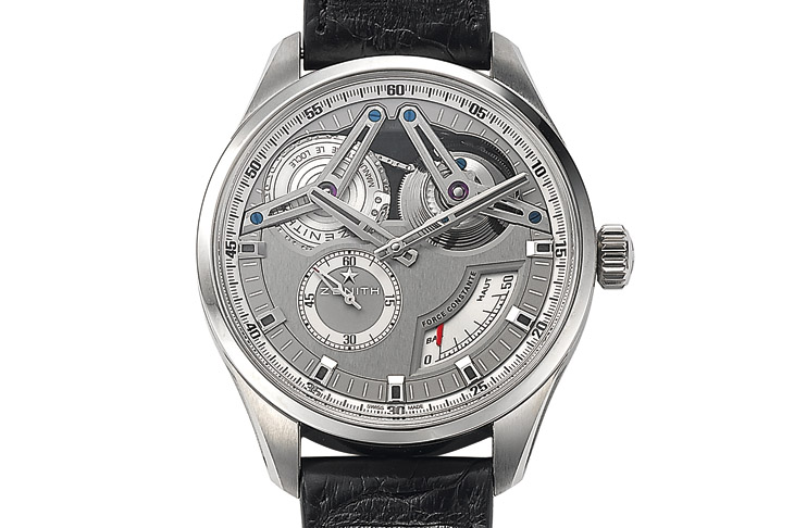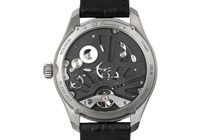 ▲ 鈦金属材质/El Primero 4810 C手动上鍊机芯/时、分、小秒显示/芝麻鍊装置、动力储存显示/C.O.S.C.天文台认证/鱷鱼皮表带、蝴蝶扣/蓝宝石水晶镜面、螺丝固定式透明底盖/防水100米/参考价:NT$ 2,315,000/查询电话:(02)2778-7266