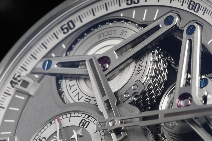 机芯的重点自然是它巨大的芝麻鍊结构,机构整整佔去了半枚机芯,而表款设计上也很直接地将这点秀在表面上。芝麻鍊堪称是目前最古老的恆定动力系统,它以鍊条连接发条盒和宝塔轮,利用宝塔轮的锥状结构,当发条满鍊扭力强劲时鍊条盘在塔轮顶端,由于顶部的直径短,力矩小,正好平均掉过剩的扭力,反之接近空鍊时鍊条捲到塔轮底端,大直径的大力矩也补足了扭力的贫弱,透过这样的机构所输出的动力理论上可以维持较稳定的曲线,从而提升机芯整体运作的品质。