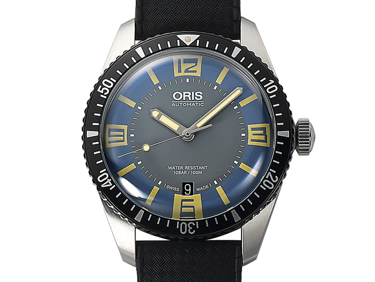 ▲ 不锈钢材质/Oris 733自动上鍊机芯/时、分、秒、日期显示/橡胶表带、一般扣/蓝宝石水晶镜面、旋入式底盖/防水100米/参考价:NT$ 54,000/查询电话:(02)7709-6687