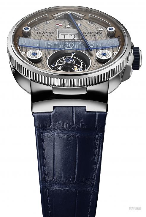 这款复杂的机械装置呈现于 44 毫米的白金表壳内,防水可达 100 米。《Grand Deck 大航海旗舰陀飞轮》的面盘设计正如一艘设计精巧的豪华巨轮。蓝色橡胶凹痕的旋入式表冠搭配钱币纹表圈,手工刻制而成的柚木纹理面盘极为精致,让人联想起阳光照射下的甲板。蓝色铝制分针滑竿在 3 点至 9 点之间的半透明蓝尖晶石弧形刻度移动;滑竿由一根高科技奈米线连接着四个由蓝色星形螺丝固定的滑轮,与添加了雅典船锚标誌的陀飞轮互相辉映。此外,面盘顶部的边框细节和装饰线设计都极其精巧,将航海元素微妙的融入其中。雅典表航海腕表系列的荣誉标誌放置在代表着 "U"和"N"的国际信号旗中央,呼应品牌在歷史上曾为船舶设计过天文台鐘。