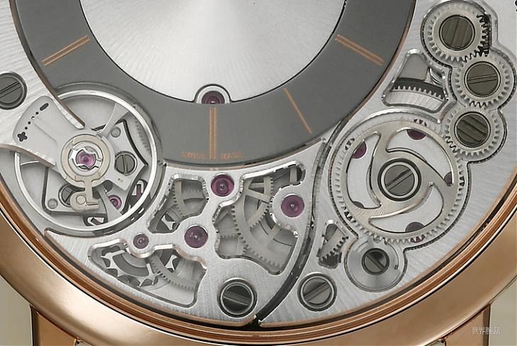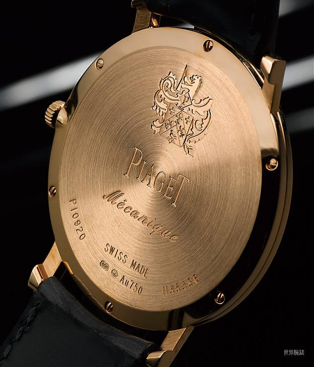 ▲900P机芯乍看被包裹在实底盖下,同心圆纹底盖表面尚刻印有伯爵家徽与品牌字样作为装饰,不过实际上此底盖也就是900P机芯的基板,局部机芯零件直接固定在表底盖上因而让表款厚度得以再往下降。