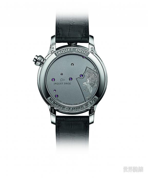 相较于面盘上裸现机芯正面结构的复杂立体感,表背机芯基板便显得低调许多,近乎全幅式的设计虽然盖住了所有机芯零件,不过品牌还是精心鐫刻出雀鸟振翅的图像增强视觉美感。