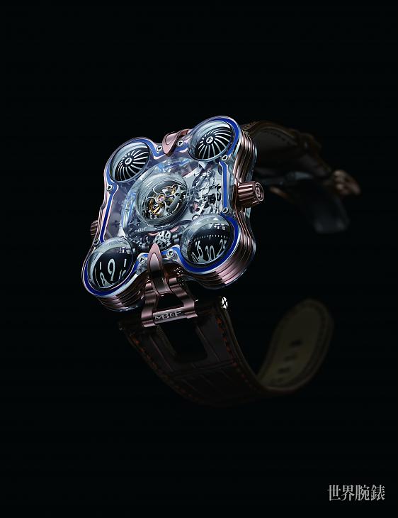 HM6 SV带有流线型现代艺术的精神,其表镜配合奇异机芯构造打造出的多重凸面极考验加工技术,而由球体零件显时的设计也堪称品牌一绝,至于伴随中置陀飞轮设置的鈦金属保护罩除了实用考量,也富有太空飞行器般的科幻想像空间。玫瑰金材质/自动上鍊机芯/时、分显示/陀飞轮装置/防水30米/表径51x50mm/限量10只/参考价:电洽