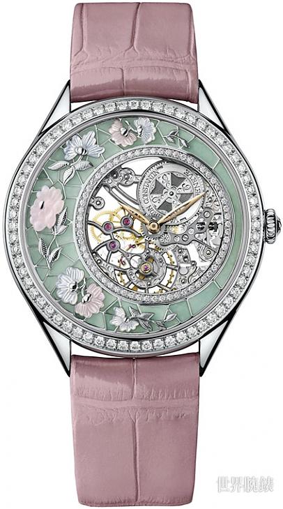 2016年全新的Metiers d'Art系列以工艺展示世界不同文化中装饰艺术的独特魅力,眼前这款为揣摩中国刺绣,由珍珠母贝雕刻而成的面盘以白金掐丝工艺勾勒,镶嵌翡翠,并饰以宝石雕刻工艺切割雕琢而成的粉红蛋白石,再点缀有精致的金质叶子和花蕊,此外表款更获得日内瓦印记认证。18K白金材质/1300手动上鍊机芯/偏心时、偏心分显示/仿中国刺绣白金掐丝、宝石雕刻面盘/蓝宝石水晶镜面/表径37mm/ 限量20只/参考价:NT$ 4,710,000