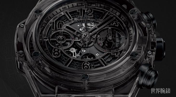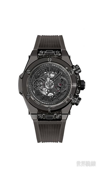 黑色烟燻蓝宝石材质/HUB 1242 Unico自动上鍊机芯/时、分、小秒/计时码表功能/蓝宝石水晶镜面、透明底盖/防水100米/表径45mm/限量500只/参考价:NT$ 2,080,000