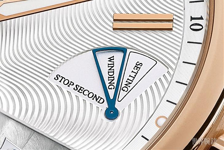 表盘2~3点位置备有表冠设定与快速停秒显示,可告知佩戴者表冠设置的相应位置:位置1用于给机芯上鍊,位置2用于设定时间和快速停秒装置。