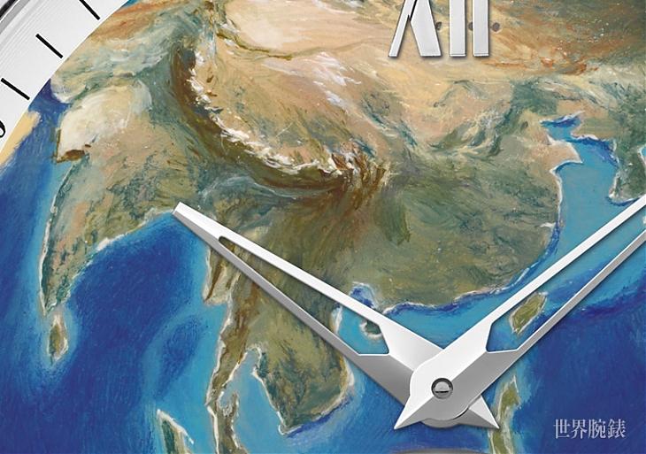 叁款表作分别以北美、亚洲和欧洲大陆为创作主题,将微型地图人手绘制于盘面上,渐层的色彩在蔚蓝海洋与宏伟陆地上扩展,呈现跨大西洋的旅行主题。