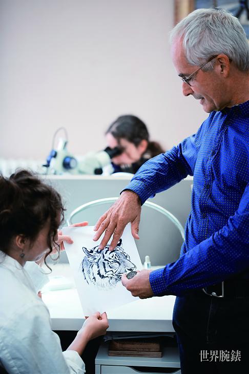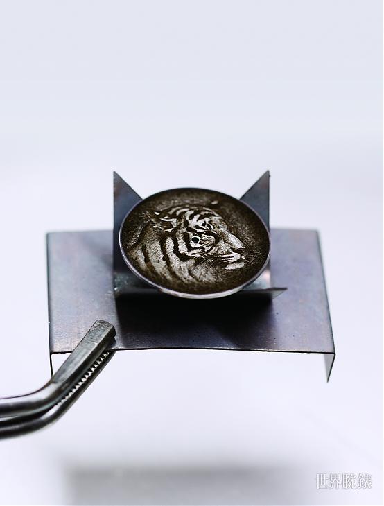 「渐变珐琅」工艺在暗花装饰的基础下演变而成,其利用珐琅彩与雕刻效应来营造立体的效果。由于珐琅彩会于雕刻的凹陷位置大量积聚,而仅微微遮盖凸起的部位,因此雕刻家先以浮雕技法表现主题图案,再涂上半透明珐琅彩,从而构成具摄人魅力的图案。在正式于白金基板进行雕刻前,雕刻师要先与珐琅师商讨与确认每一个细节,两人合力分析初始设计及期望的透明程度等,决定光圈、光线和阴影的地带,金雕师再根据最终图案所需的透明、浓淡程度,在白金基板上将老虎的每一个神态,甚至每一根毛髮都完完全全地复制,同时更需考虑採光或折射光线等状况小心拿捏力度,使老虎能随着光线的渗入而呈现令人难以置信的深浅细腻层次,呈现立体感十足的姿态。
