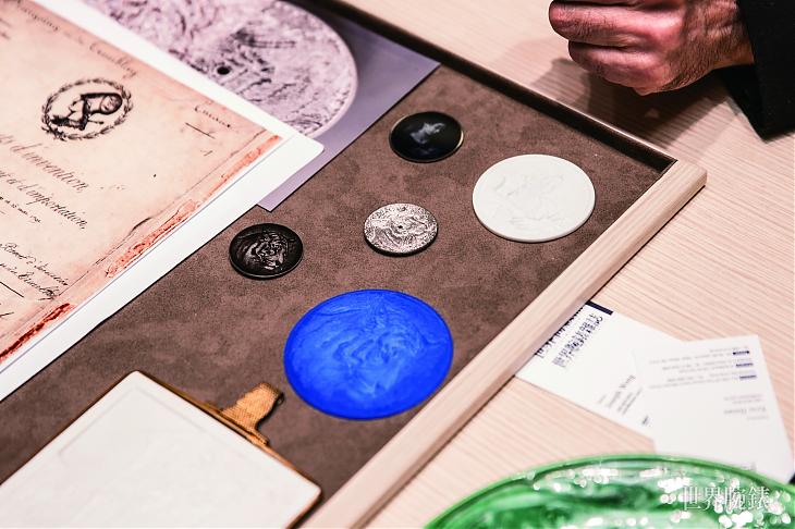 Olivier Vaucher于访谈期间展出数款採用暗花装饰及渐变珐琅工艺的模板,从1841年的原设计到今天的Arceau Tigre 渐变珐琅腕表,见证工艺的进步。