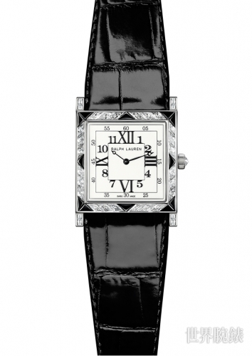 新款 867 钻石腕表的外观则较为庄严与富丽堂皇,直径为 27.5 毫米的方形表壳光泽耀眼,并搭载由Piaget专为Ralph Lauren 打造的瑞士石英机芯。 18k白金表壳及扣环上以几何造型镶嵌了44 颗方形美钻、18 颗黑色尖晶石及1 颗玫瑰形美钻(约重4.60 克拉),璀璨晶莹与华贵炫目的黑色鱷鱼皮表带相依相偎。精致的米白色珐琅表盘上以宝璣式指 针展现光阴流淌。