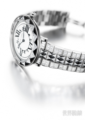 从宝石切割及镶嵌到18k白金底座的复杂制作过程,以及最后嵌入瑞士制造石英机芯 RL888 钻石腕表共耗费 600 小时。表圈及表带上饰有令人惊艳的的装饰艺术图案,并镶嵌了414 颗方形美钻、159 颗黑色尖晶石、13 颗美钻及1 颗玫瑰形美钻,总重约17.31 克拉,而女人味十足的18k 白金表带上则设有6 个可调节式链节,可藉此进行个性化调整。直径为 38 毫米的表壳外观精致优美,与雍容华贵的白色珐琅表盘相互辉映。