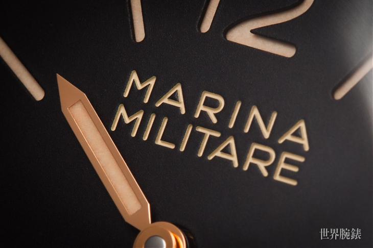 ▲经典的时分镭针佈局、Plexiglas®树脂玻璃表镜、阿拉伯数字3-6-9-12时标配置,以及十二点鐘位置的”MARINA MILITARE”字样,使得PAM673相当惹火,尤其金色时标、指针与黑色面盘的相互映衬下,透露出些许迷人又内敛的风采。