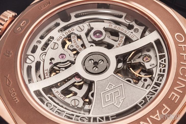 机芯是沛纳海很久以前就着力很深的一块,早在2002年沛纳海就开始着手进行自产机芯,到了2005年推出第一枚P.2002自制机芯,而PAM00659所搭载的P.2003/10机芯,其实是P.2003机芯的鏤空版本,如果回顾到更远一点,P.2003机芯建基于P.2002手上鍊机芯身上,所以P.2003/10机芯具备了P.2002机芯原有的叁发条盒设计,因此动力储存长达十天以上;P.2002机芯与P.2003机芯的差别在于,P.2003机芯加装了自动上鍊结构,成为实用性更高的机种。