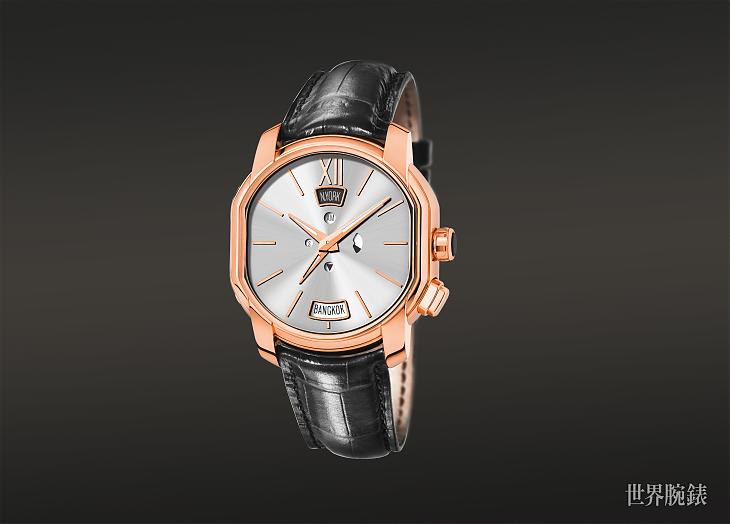 飞行常客因工作或业务而经常出埠。HORA DOMVS 表盘纯净而素雅,佈局简洁明晰,为旅行者提供精准的时计功能。四点鐘位置有个按钮,可选择目的地城市,透过特定箭嘴指示可以读取窗口显示的名称;对应的时间则由一枚实心指针显示。同时,原居地时间仍由一枚鏤空时针显示,不因时区改变而变更。