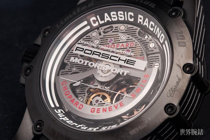保时捷919 Hybrid赛车是一台超过 900 匹马力的超强悍强劲引擎的赛车,而如此强大威力的引擎在萧邦打造的Superfast Chrono Porsche 919 Black Edition黑鈦版腕表中则化作萧邦实力打造的高规格自制机芯-Chopard 03.05-M,这机芯完全由萧邦弗勒里耶机芯制造厂(Fleurier Ebauches)制造、组装而成,并获得瑞士官方天文台(C.O.S.C.)认证,,拥有卓越精准性能。Chopard 03.05-M机芯除了长达60小时的动力储备功能之外,腕表亦配备飞返计时功能。透明蓝宝石水晶表底盖鐫刻「Official Timing Partner Porsche Motorsport」(保时捷车队官方计时合作伙伴)及保时捷车队标誌,透过表底盖一览萧邦特别打造的条纹装饰表桥的顶级机械,令人彷彿听见真准备蓄势待发哼哼作响的赛车引擎。