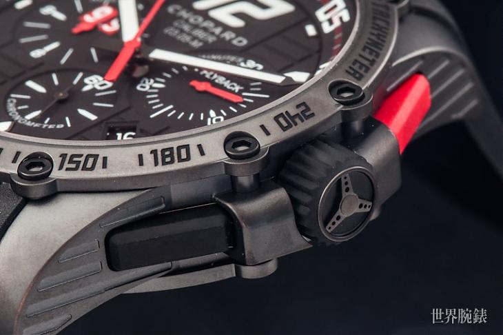 位于2时位置的按把覆饰红色橡胶,用以控制计时码表的启动与停止功能。而位于4时位置的按把则覆饰黑色橡胶并用以控制归零功能,表冠缀以方向盘的标誌,再添一赛车元素。表壳中层侧缘的条纹设计源自赛车引擎的散热翼片,此独家装饰细节巧妙呼应表盘的线形饰纹,而这条纹设计则借鉴保时捷919 Hybrid混合动力赛车的后散热器,跑车除了讲究性能,充满设计感的车身同样是叫人热爱,萧邦亦深懂这一点并大量运用在Superfast Chrono Porsche 919 Black Edition黑鈦版腕表中,实在太犯规。
