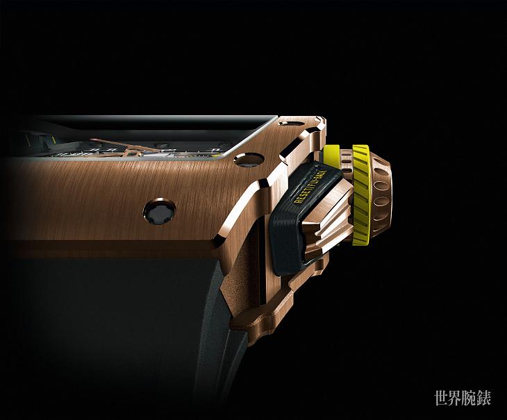 在RM 11-03上有诸多细节让人联想到赛车的元素。 鈦合金表冠的独特设计就源自赛车的轮輞和轮胎花纹。刻有沟槽的按钮材料让人联想到赛车踏板的表面,而该物料正相等于鈦合金在一级方程式赛车中的普遍使用:NTPT 碳纤维。正如Richard Mille的一贯传统,RM 11-03整个构造的点点滴滴无不令人称奇,比如表盘採用的蓝宝石水晶,经过防眩处理,恰到好处地呈现出机芯的复杂精密。 RM 11-03整个表壳由20枚5级鈦合金材质的花键螺丝组装而成,共有红金、白金和鈦合金叁种款式。RM 11-03飞返计时码表是一枚全面的运动型腕表,骄傲地詮释了 Richard Mille的最新美学。
