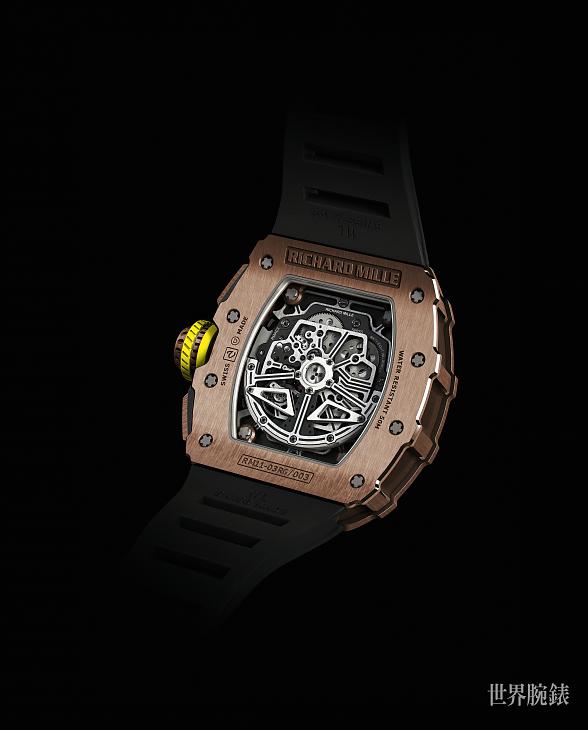 叁层式的表壳经重新设计,既保持了腕表原有风格,更增添了几分时尚与活力,使腕表的运动感十足。精湛的工艺和不计其数的制作程序带来极高的舒适度和完美的拋光效果,造就了鐘表界独一无二的表壳。表面的打磨完全由手工完成,精美细致、耗时漫长。这种外形设计最初在RM 27-01拉菲尔·纳达尔腕表上出现,现已成为Richard Mille运动腕表的独特标誌。除了与休閒腕表有明显的区分外,这种设计还能极大地促进结构的融合。