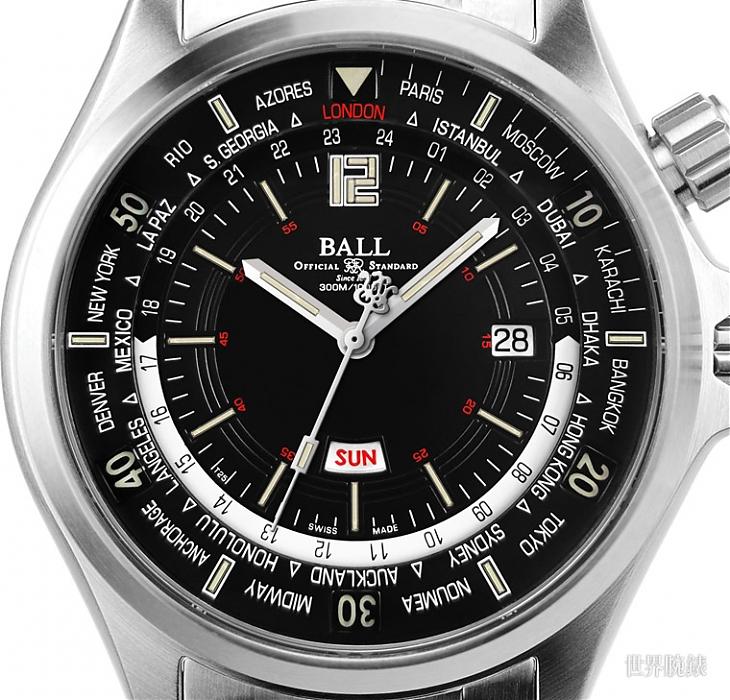 BALL WATCH Engineer Master II Diver Worldtime是全球首创结合了星期、日期显示及24小时的第二时区显示功能的腕表,搭载瑞士制造的BALL RR 1501机芯增加了世界时间功能。在腕表中央的叁支指针显示本地时间,面盘有一个自动以反时针方向转动、并刻有各大主要城市名称的24小时盘,可同时显示全球24个不同时区的时间。Engineer Master II Diver Worldtime型号有一个双向的旋转内置计时圈,由位于2点鐘位置的旋入式表冠所操控。此功能令佩戴者可准确计算剩餘潜水时间,并防止任何意外移动了潜水计时圈,从而确保不会高估剩餘时间,确保潜水员的安全,防水性能进一步提升至高达水深300 米,部分原因是由于旋入式表冠能确保防水性能可达至此深度。