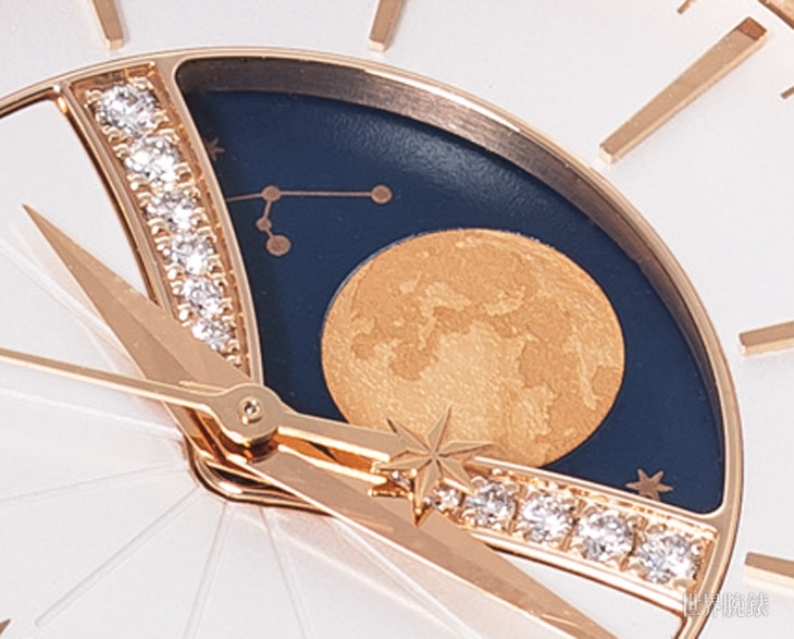 Limelight并非是新系列,而伯爵选择在其家族增添备有复杂功能的成员,似乎有点在试水温的感觉,不可否认女性高级手表的需求量提高成了各家品牌无法忽略的市场。作为这个家族第一只出来打头阵的复杂功能女性手表,笔者认为选择加入月相显示功能是适当的。市场上许多简单的叁针或是日期搭上月相显示功能的表款,就算想作复杂一点的模组各种现成模组也不少。儘管月相显示已脱离实用目的,但是这装饰成份颇高的复杂功能本身依然有很大的可塑性。消费者真正追求的是设计有趣、做工精致的月相显示。