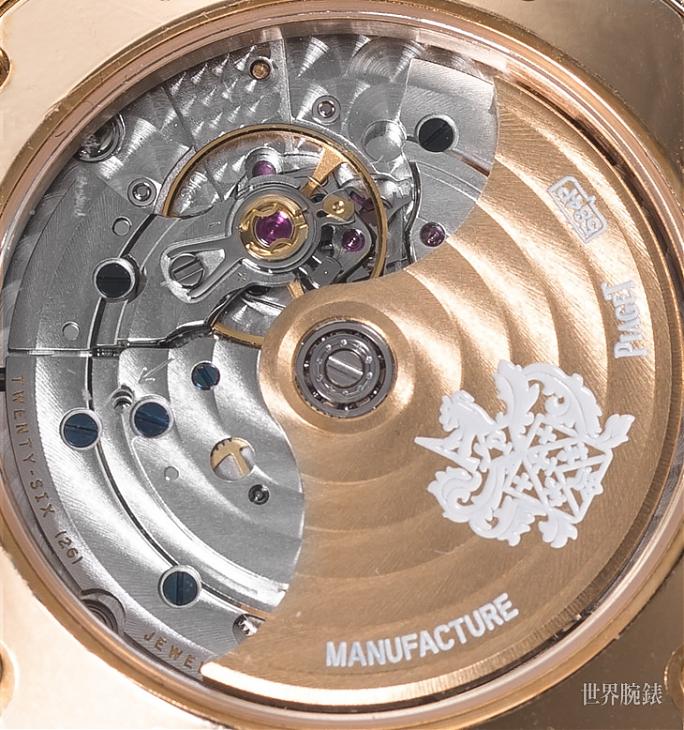 ▲ 在蓝宝石水晶底盖下,环状缎面磨砂、倒角表桥、日内瓦波状饰纹、蓝钢螺丝,以及摆陀上的伯爵徽章纤毫毕现,细腻动人。