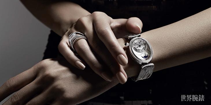 这款Reine de Naples那不勒斯皇后的灵感起源,是宝璣做给拿破崙的胞妹Caroline Murat的手鐲表,带有珠宝的元素,表壳是独特的蛋型设计,小秒针位于七点鐘方位,并有动力储存和月相显示。