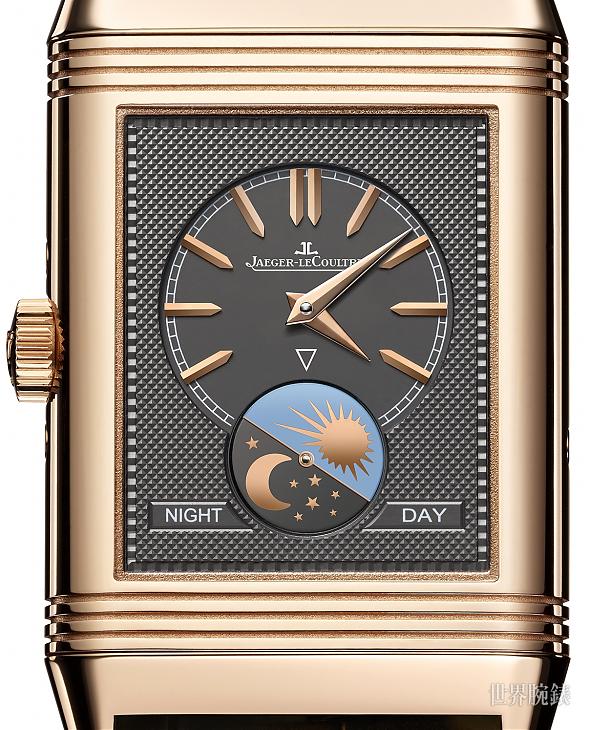 翻转到另一面,可以看到灰色扭索饰纹面盘与前面做出了明显的区隔,而这一面则是搭载了Reverso翻转系列腕表独有的Duo双时区功能,再度彰显积家的用心。此外,六点鐘位置搭配了日/夜显示功能,与另一面的月相显示互相对照,并透过上方的小叁角清楚标示,每一面都涵盖了复杂功能的时计。
