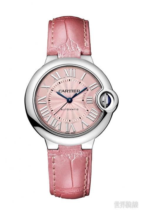 Ballon Bleu蓝气球是很独特又很多人喜爱的系列,粉红压纹的面盘,特点是以及表冠被贵金属环绕、表盘时标轨道变形的设计,是卡地亚近代非常成功的代表作。