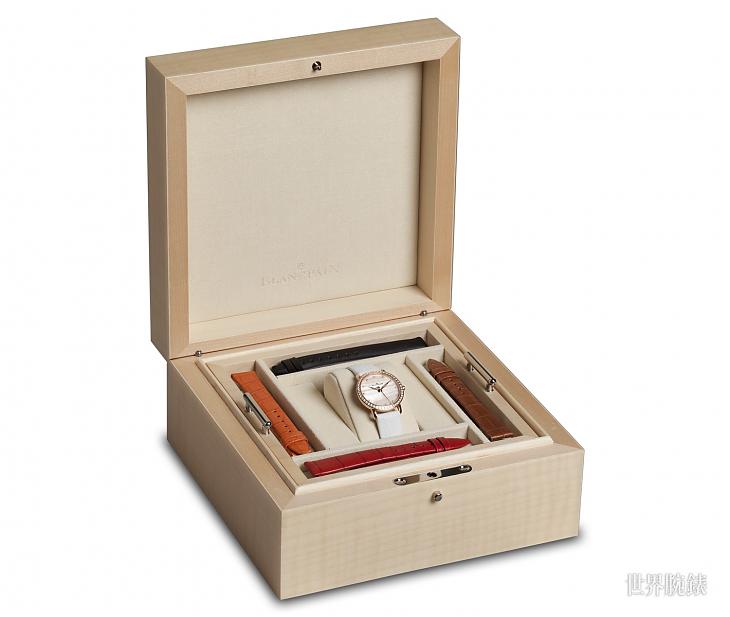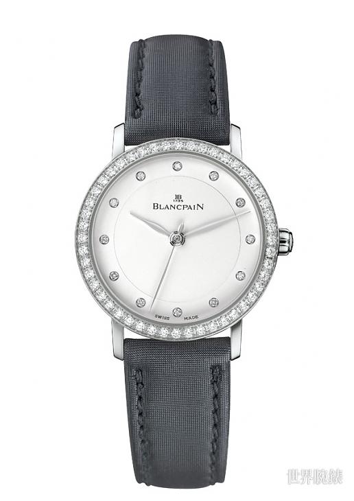 这款Villeret Ultra Slim是29mm的超薄设计,表圈镶钻、面盘点钻;附5款不同顏色的鱷鱼皮表带,上下对称的压纹,间隔都在1.5公分左右,可以用快拆的方式做替换,很适合女性朋友搭配日常的服装、心情做变化。