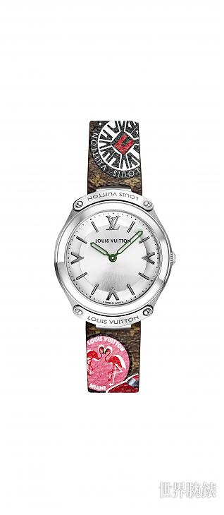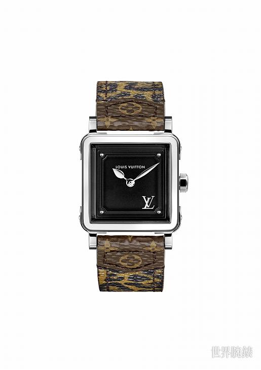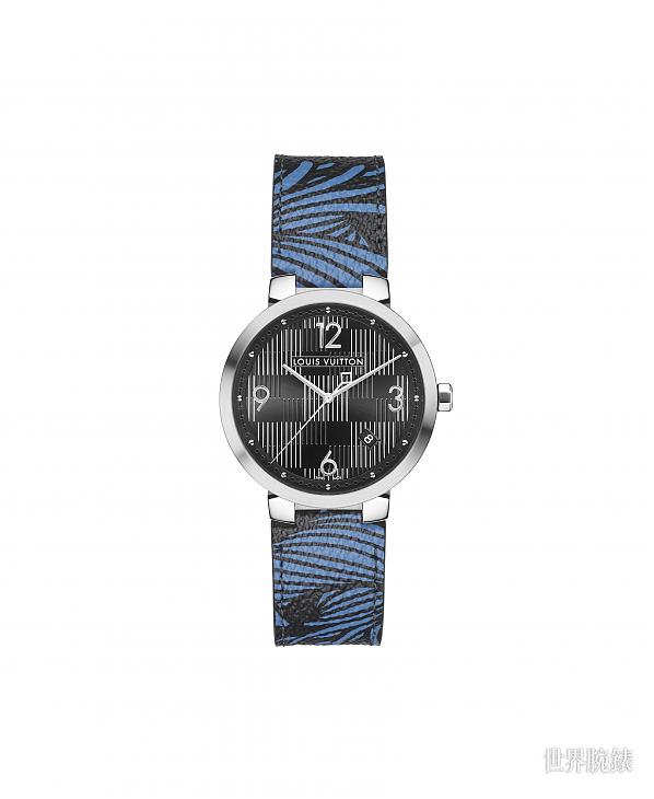 另一只新表款也是来自Tambour Slim系列,表壳同样採不锈钢材质,不过表盘所装饰的图案乃Damier,十分特别。同时表盘上还有小饰钉装饰,这给表盘增添了些许俏皮感。此表款搭配Damier Graphite帆布表带,表带上有着蓝色绳状图案,整体来说这是一只很抢眼特殊的表款。LV全新叁只表款,处处能见品牌经典元素,特殊的造型也让人过目不忘。