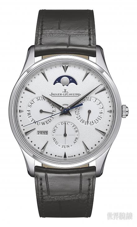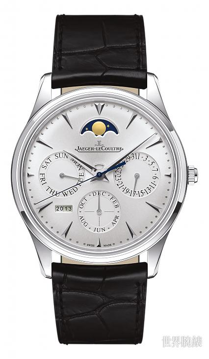 面盘中心点上方有一个矩型小窗口,为午夜调校警示,平时与面盘色调一致,一旦机芯进入幻日程序,就会改变色调,主要功用在提醒于这段时间内避免调校动作,以免让齿轮受损。而为了不要遮住视窗,时、分针的基部特意做成鏤空样式,可说是品牌在万年历表款上的一大特色。此系列有2种款式,一款为白金表壳搭配银色面盘;另一款为不锈钢表壳搭配镀银粒纹面盘。而这款腕表不仅正面有看头,其配备的蓝宝石水晶底盖,机芯之美及零件上的高级制表装饰,都可一览无遗。