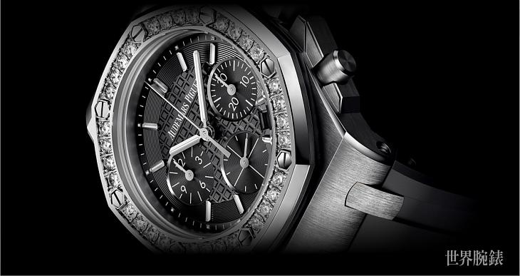 ▲AP皇家橡树离岸型系列计时码表,全新格纹装饰, 表圈镶嵌钻石,整只表款亮眼无比
