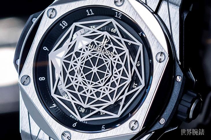 ▲Big Bang Sang Bleu结合圆形、方形、叁角形等线条交叠重组的全新设计元素,赋予Big Bang腕表视觉上更加立体的立体效果。