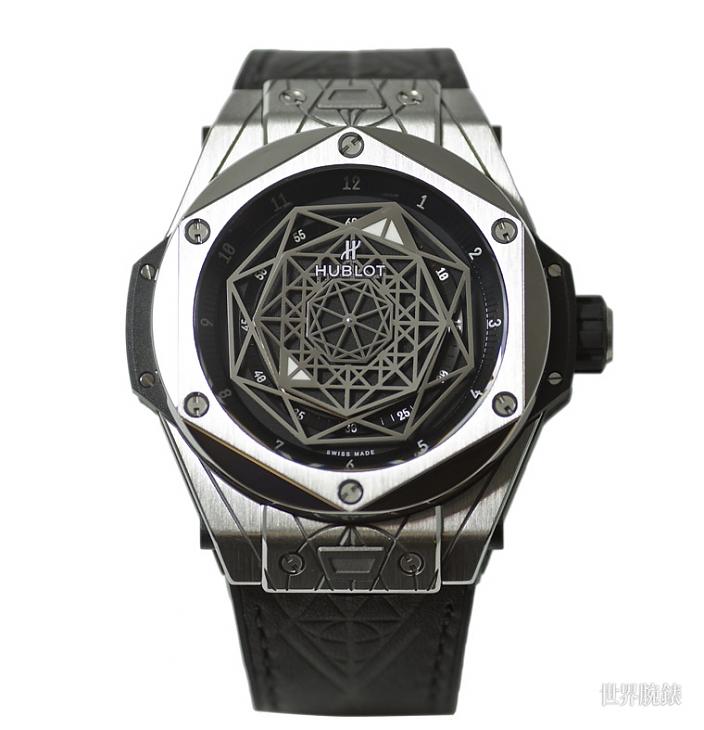 Big Bang Sang Bleu 45毫米雾面色面盘上,呈现出粗缎面光圆环,并在其上印有小时标记。此外,阿拉伯数字的字形是Maxime Büchi专为这款腕表的另一项全新设计,至于秒针指示,源自金属雕塑中的图像,装饰于面盘之上。就像是为了要强调他的神祕性格,并赋予时间另一种维度,面盘上没有任何指针。时间由面盘上叁个层层相叠的镀銠八角形碟盘来显示,充满「达文西密码」的神祕味道。多层次的大小碟盘中,最大的碟盘显示小时,第二层则是显示分鐘,为了更清晰明白地显示时间,八角形碟盘中有一个角特别突出,并且具有白色夜光功能显示。至于秒针,则由中央的黑色转盘显示,其上印有Hublot的H字母标誌与Sang Bleu的风格化沙漏印记。面盘上的图案延伸到直径45毫米的鈦金属表壳之上,以精雕方式刻印出类似雕塑上的几何线条,与六角造型的表壳相呼应,在视觉呈现无限延伸的美感。