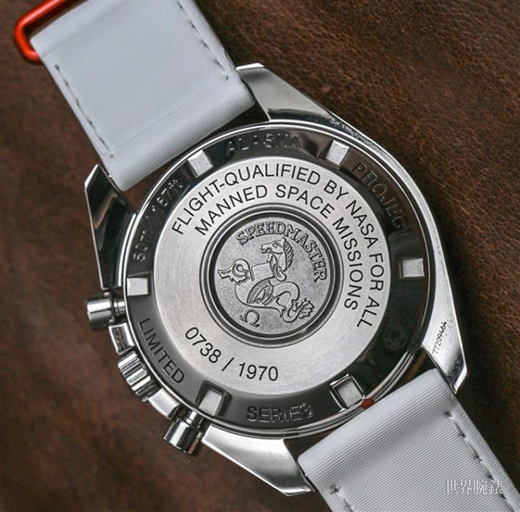 ▲表背鐫刻海马徽章、登月纪念铭文和限量序号,彰显超霸阿拉斯加计画登月表的收藏价值。