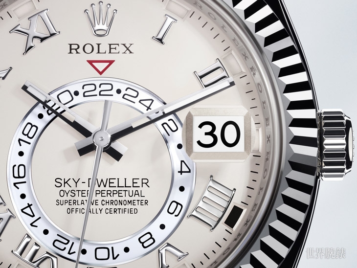 全新Sky Dweller拥有劳力士一贯「化繁为简」的特质,面盘显示很清楚,就算是不常戴机械表的人也看得明白。坐落在红色叁角指示下方的小时环为双时区显示,佔了面盘将近2/3的面积,方便读时。而且数字紧贴罗马时标分设内外圈,区别两地时间的显示,让界面变得更易判读。另外,它拥有别于一般传统日历表的显示方式,仔细看可察觉罗马时标都各自对应了一个开孔,若月份为1月时就会在1点鐘时标外侧开孔的位置显示顏色。