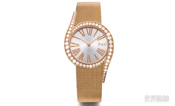 作为70年代传承下来、无庸置疑的当代风格印记,Limelight Gala腕表浓缩了伯爵的极致女性魅力,生而优雅动人、性感嫵媚。它以18K玫瑰金材质打造,表径32毫米,搭载伯爵制690P石英机芯。造型上,两条优美舒展的不对称表耳沿着圆形表壳延伸开去,让人一望既识;丰润饱满的表圈弧度更因由小渐大的单排美钻镶嵌而更显突出,它镶嵌62颗圆形美钻,约重1.75克拉。此外,纯净无暇的表盘上有着修长的罗马数字时标与之相互辉映;加以搭配的金质链带以及刻有伯爵首字母「P」字样的滑釦,令人对它的身份毋容错辨。