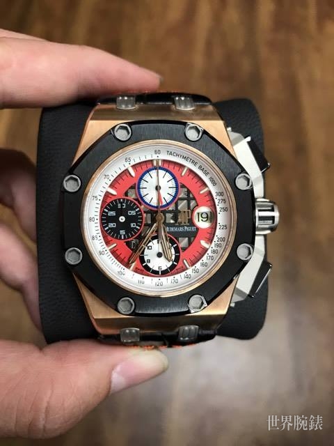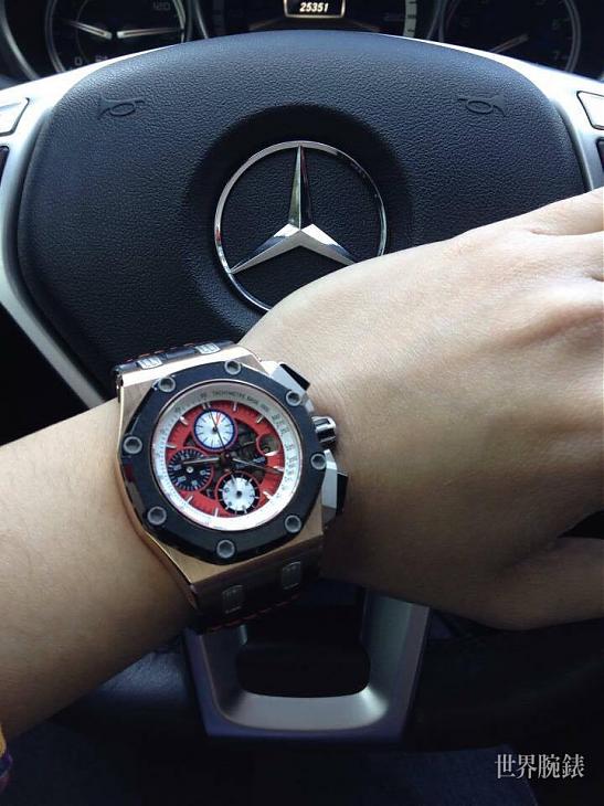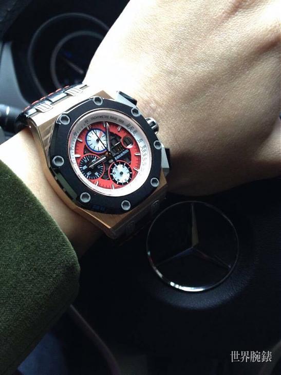 Ruben Barrichello III顾名思义,是爱彼与鲁本斯·巴里切罗合作推出的第叁代表款,以大胆抢眼的红色作为面盘主色调,与一体成型的黑色陶瓷表圈和金色表壳配搭得相当完美,深色表圈上的八个圆拱型嵌入式螺丝帽,齿轮还有彷如赛车排气孔的计时按把,独特设计加深腕表的赛车形象。「除了整体设计,出眾的配色正是它脱颖而出的魅力之一,看再久也不会腻!」