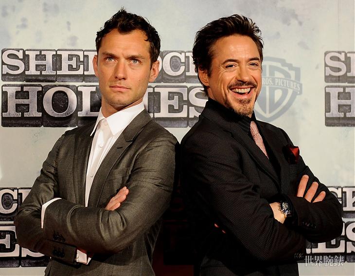 ▲电影《福尔摩斯》的宣传活动与「华生」裘德洛(左)合影,小劳勃道尼戴着CHOPARD Mille Miglia Chrono Limited Edition 2009。