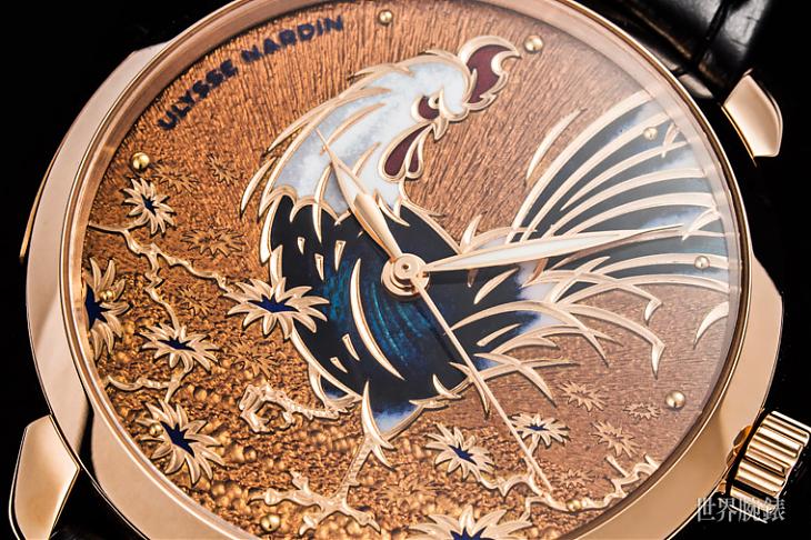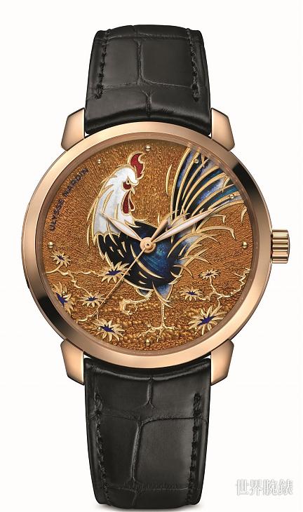 2017年恰逢中国传统十二生肖的鸡年,雅典表特别推出原创的珐琅腕表,此次以具有百年歷史的内填珐琅工艺,将十二生肖的金鸡绘于经典面盘上,将公鸡一贯昂首挺胸、精力充沛的面貌,描绘得丝丝入扣,尽现公鸡自然的力与美,欢庆恭迎2017年金鸡年的到来。