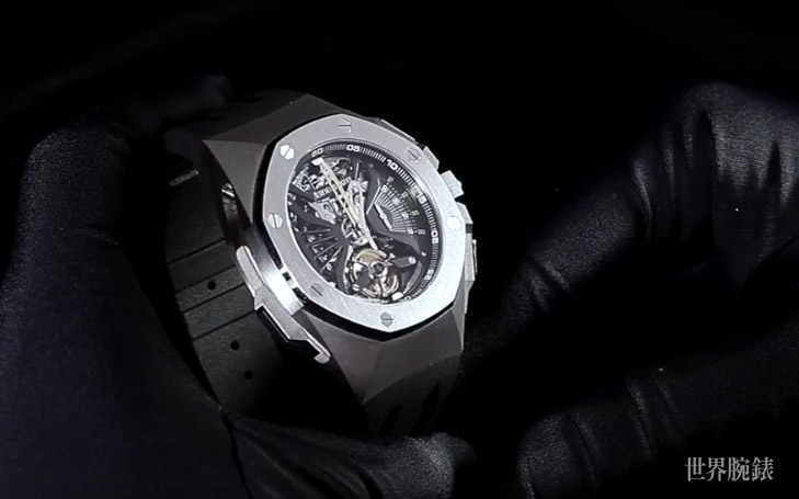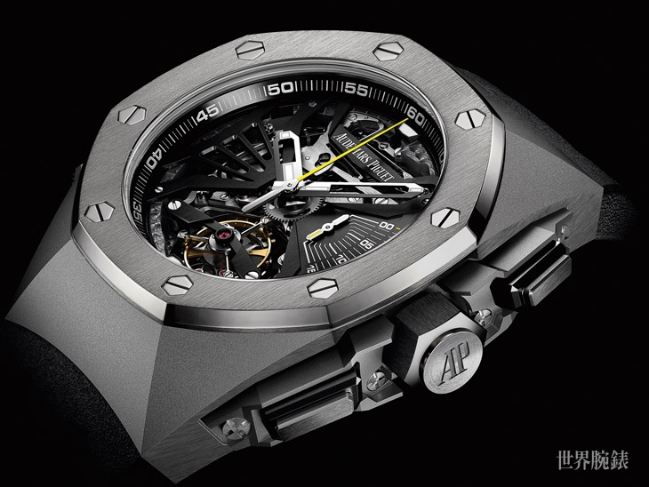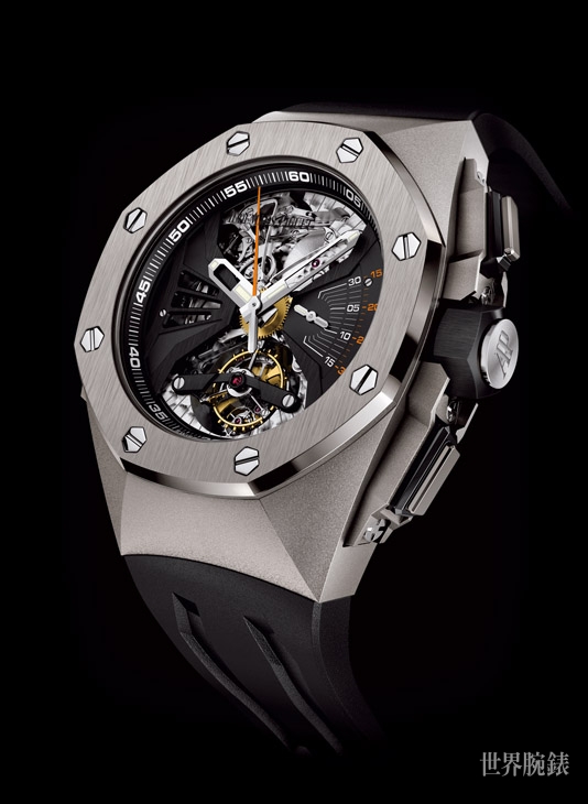 Ref. 26577TI.OO.D002CA.01/鈦金属材质/2937手动上鍊机芯/时、分显示/叁问功能/陀飞轮装置/计时码表功能/蓝宝石水晶镜面、透明底盖/防水20米/表径44mm
